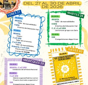 Buenos días, la semana del 27 de abril celebraremos en el cole la semana cultural. Os dejamos el cartel de las actividades que se van a realizar. Esperamos que os gusten.