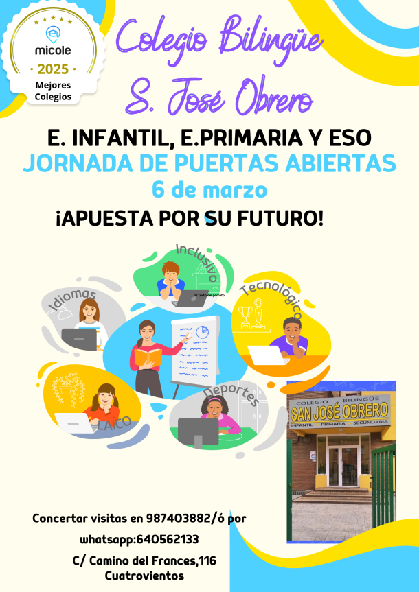 El próximo 6 de marzo, celebraremos en nuestro centro una jornada de puertas abiertas, con los siguientes horarios: – Primer turno: de 17 a 18h. – Segundo turno: de 18 a 19h. Si estáis interesados en participar, podéis reservar la plaza llamando al teléfono del colegio (987403882) o vía WhatsApp, al móvil (640562133). […]